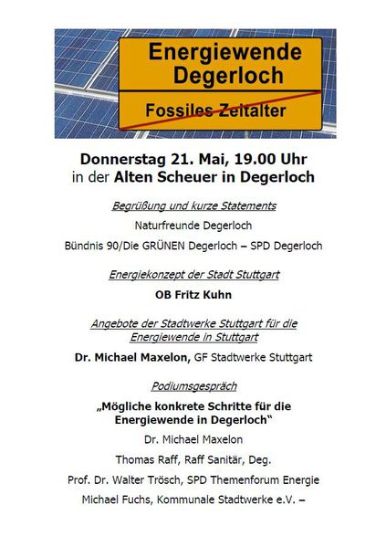 Am nächsten Donnerstag, den 21.05., veranstalten wir gemeinsam mit den Naturfreunden und den Grünen einen Abend zum Thema "Energiewende in Degerloch". Sie bekommen dort die Möglichkeit mit Experten wie dem Oberbürgermeister Fritz Kuhn oder dem Geschäftsführer der Stadtwerke, Dr. Michael Maxelon ins Gespräch zu kommen. Los geht es um 19 Uhr in der Alten Scheuer.