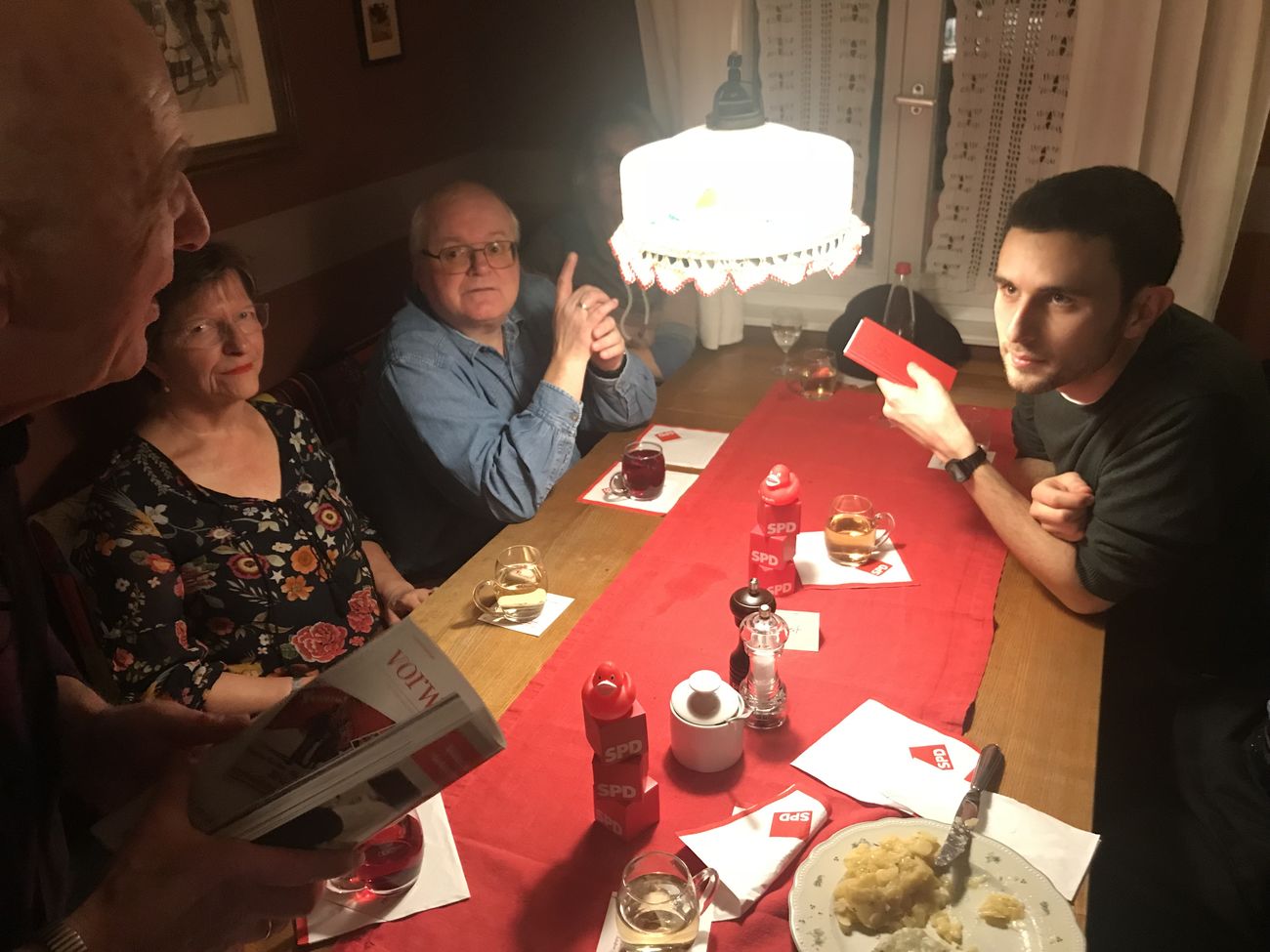 Die ganze Zeit waren eine Redakteurin, ein Kamera- und ein Tonmann im Auftrag von SPIEGEL.TV zugegen und haben aufgezeichnet, was wir so diskutieren. Außerdem haben sie uns ausführlich interviewt und die Neumitglieder befragt. Dann wurden sogar die anderen Gäste im Besen vor die Kamera und um ihre Meinung gebeten. So hatten wir an dem Abend die gesamte Aufmerksamkeit des Lokals. Je später der Abend wurde, desto mehr kreisten alle Gespräche in der übrigens sehr empfehlenswerten Besenwirtschaft (reservieren!) um die politische Lage im Allgemeinen und um die der SPD im Besonderen.